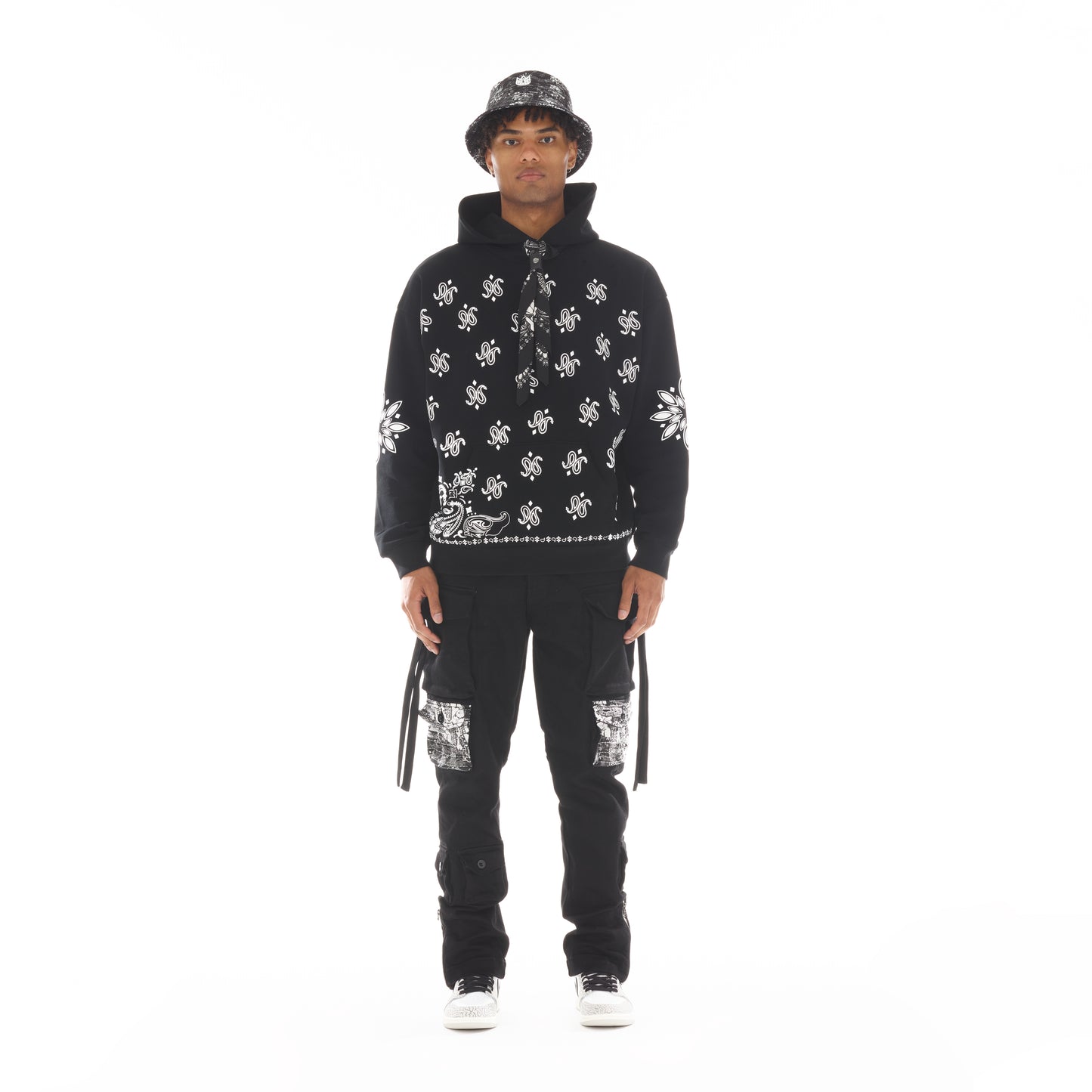 Slim style with a relaxed waist and low rise. This slim cargo in black is crafted from a premium cotton canvas narrowing from knee to ankle. This piece is accented with distressed paisley detailing on the cargo pockets, zipper accents on the ankles revealing distressed paisley insets, and our Cult signature 'XX' on the back. This rocker cargo is the perfect piece to add a tactical, rugged aesthetic with a bit of distressed flair to your wardrobe.