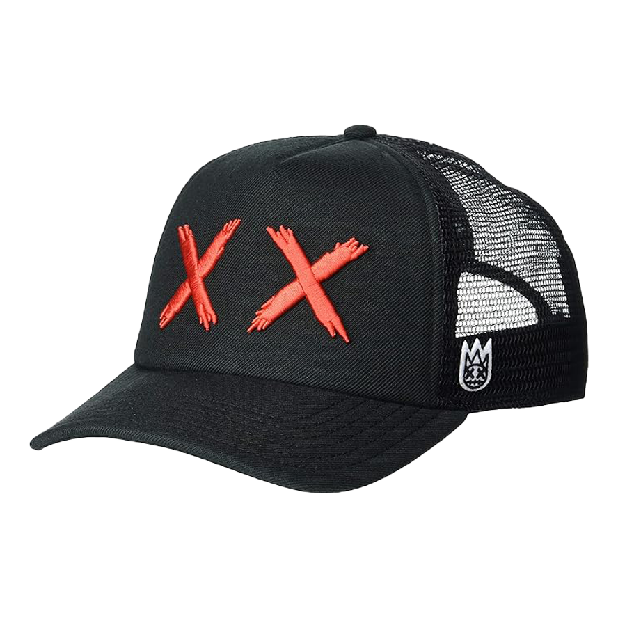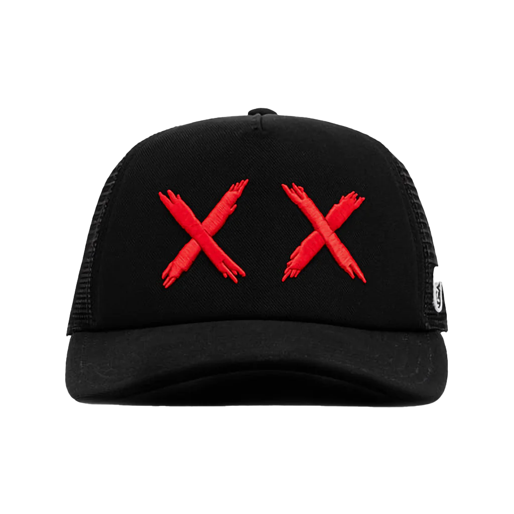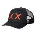Mesh trucker cap built from durable wool acrylic fabric in black with a black brim. Its adorned with a XX logo 3D raised embroidery in red.