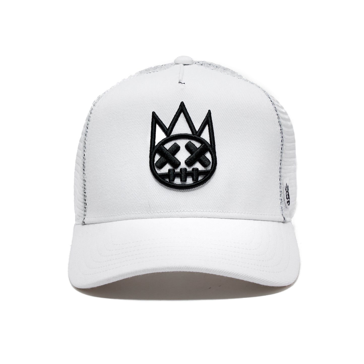 Mesh trucker cap built from durable wool acrylic fabric in white with a white brim. Its adorned with a logo 3D raised embroidery in black.