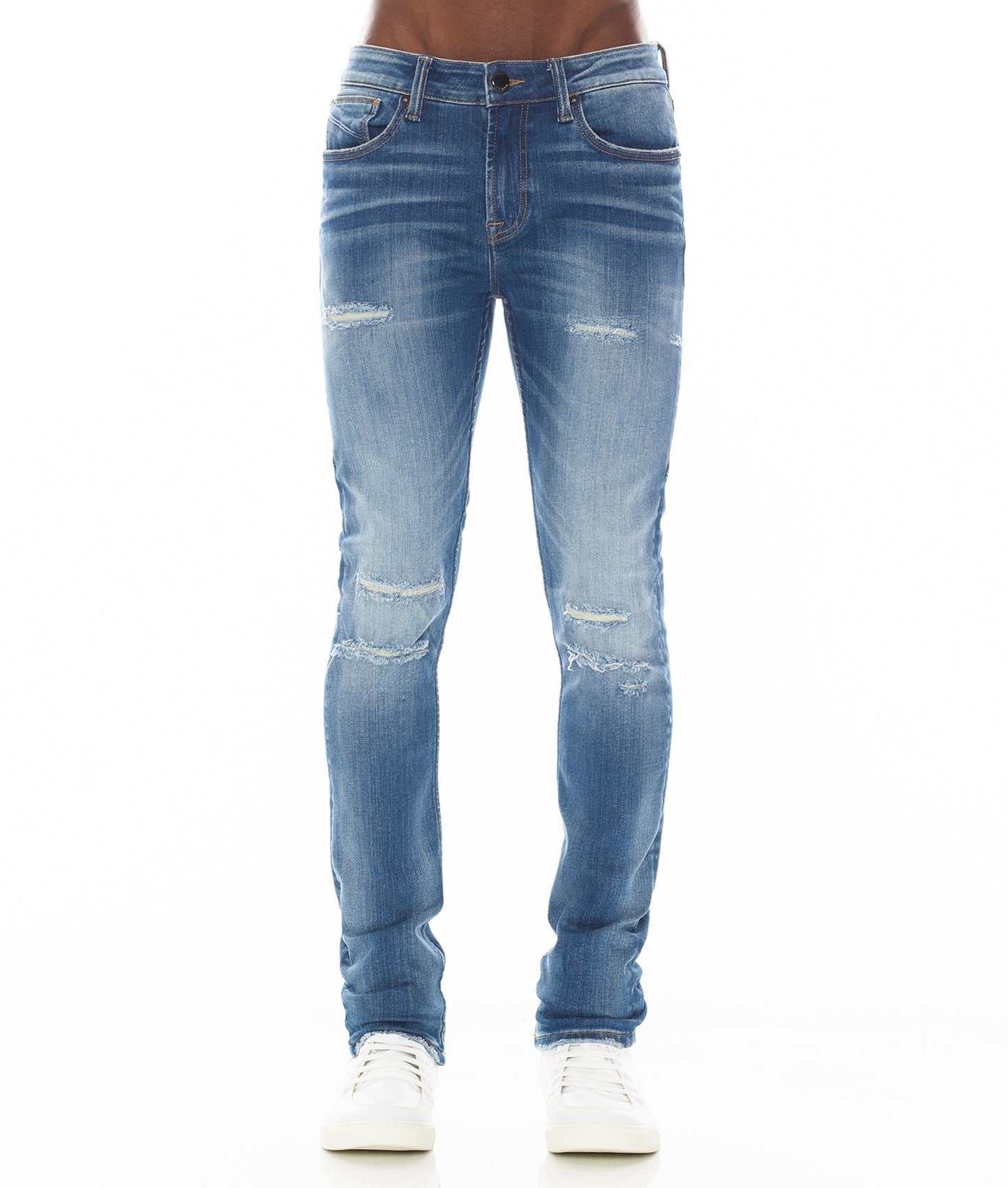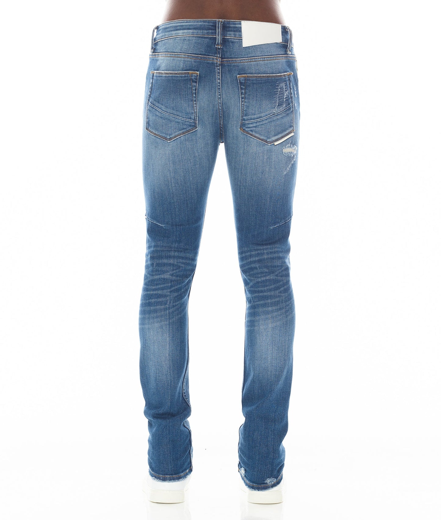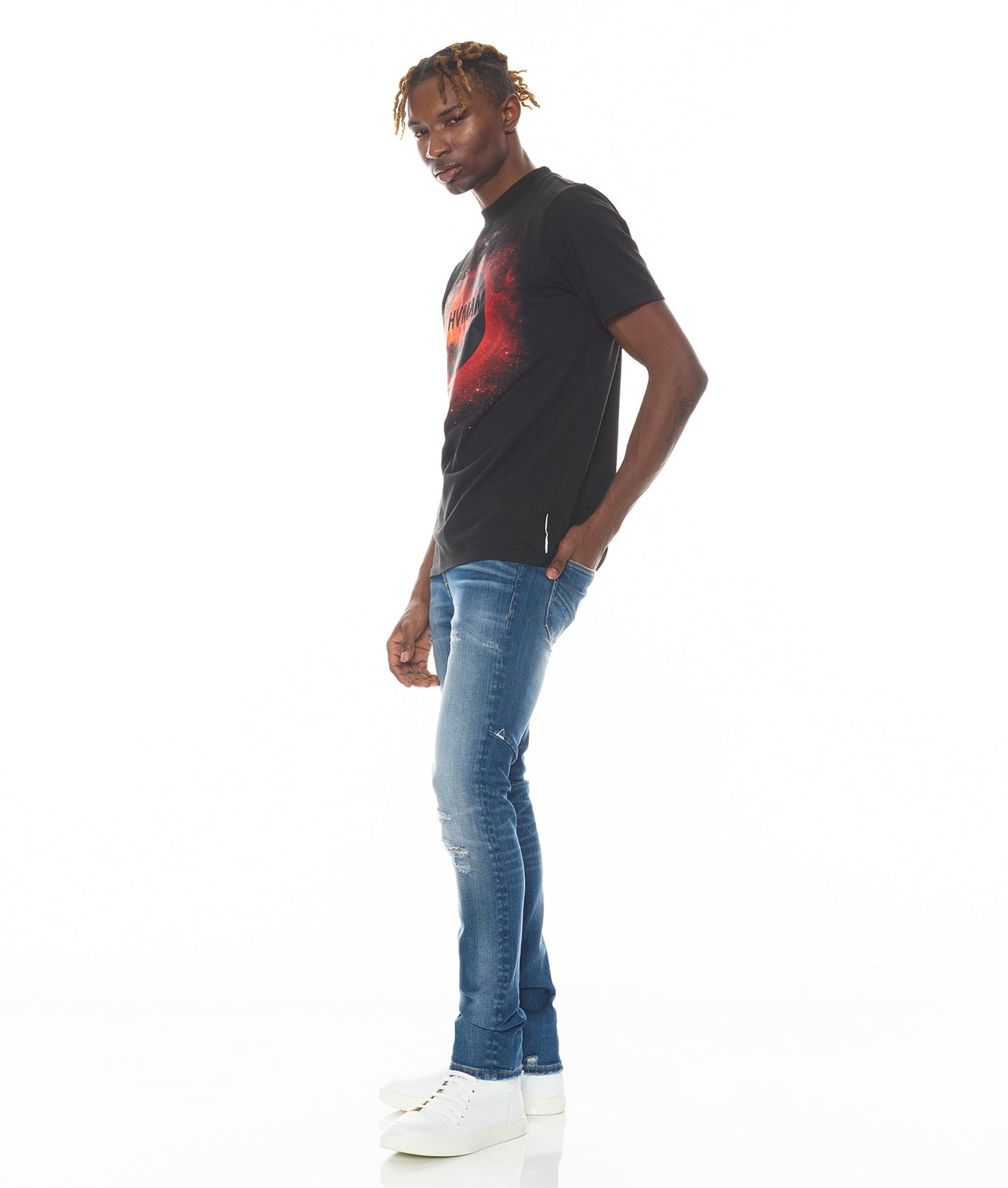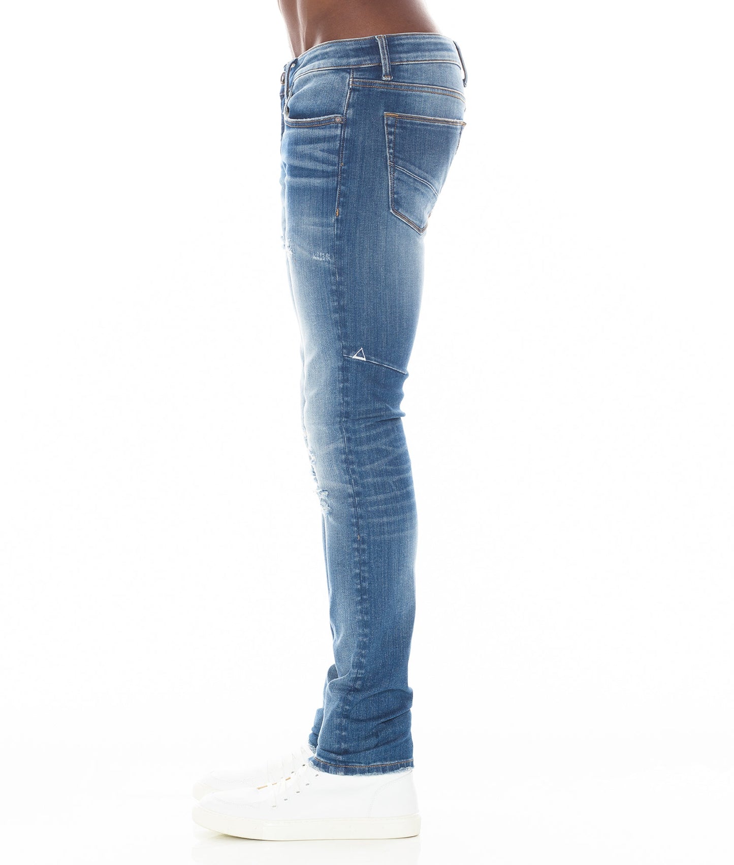 This blue stretch strat super skinny style has a narrow leg from thigh to ankle. Crafted from a premium stretch denim then vintage washed with rips for a unique design. It features the HVMAN triangle embroidery on the back.