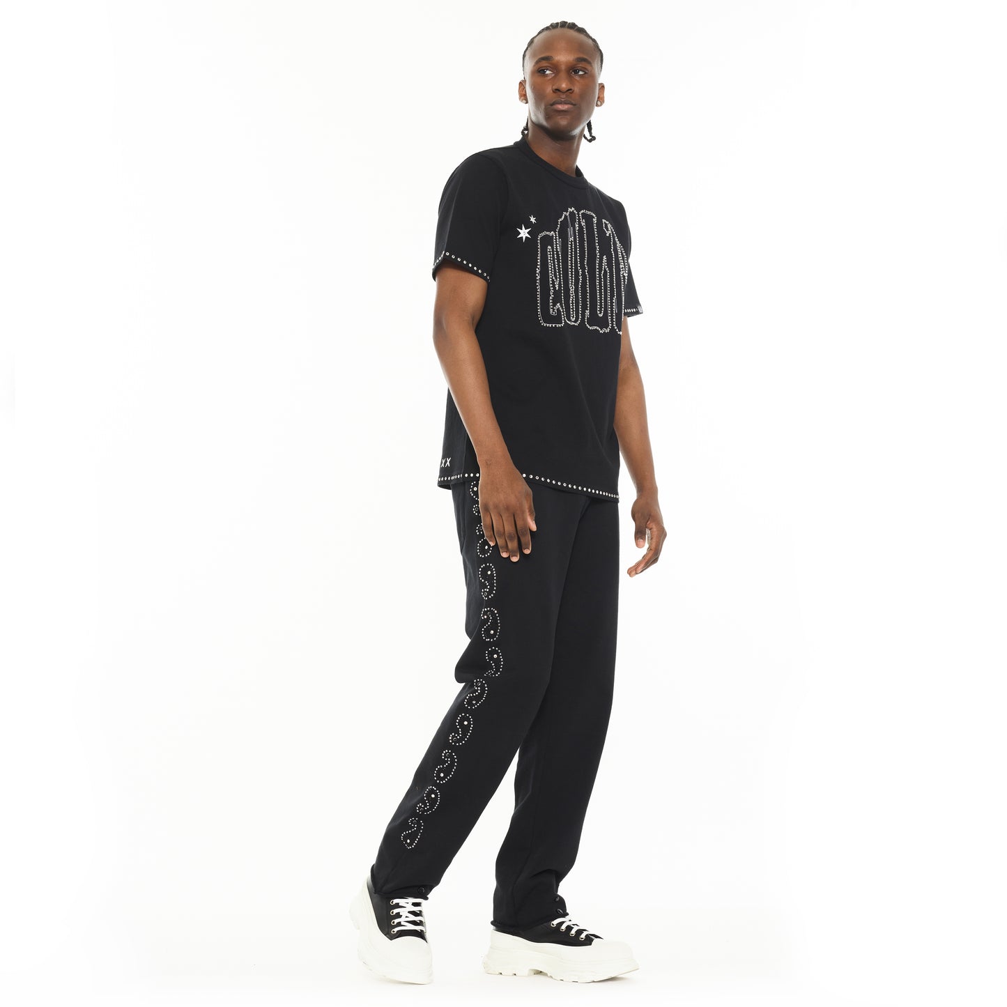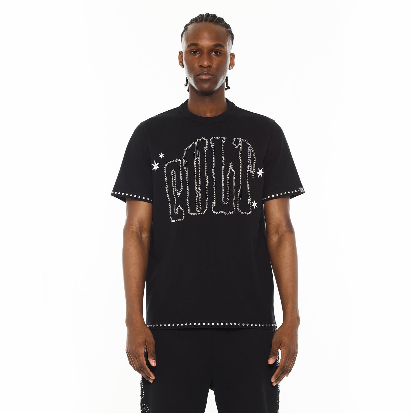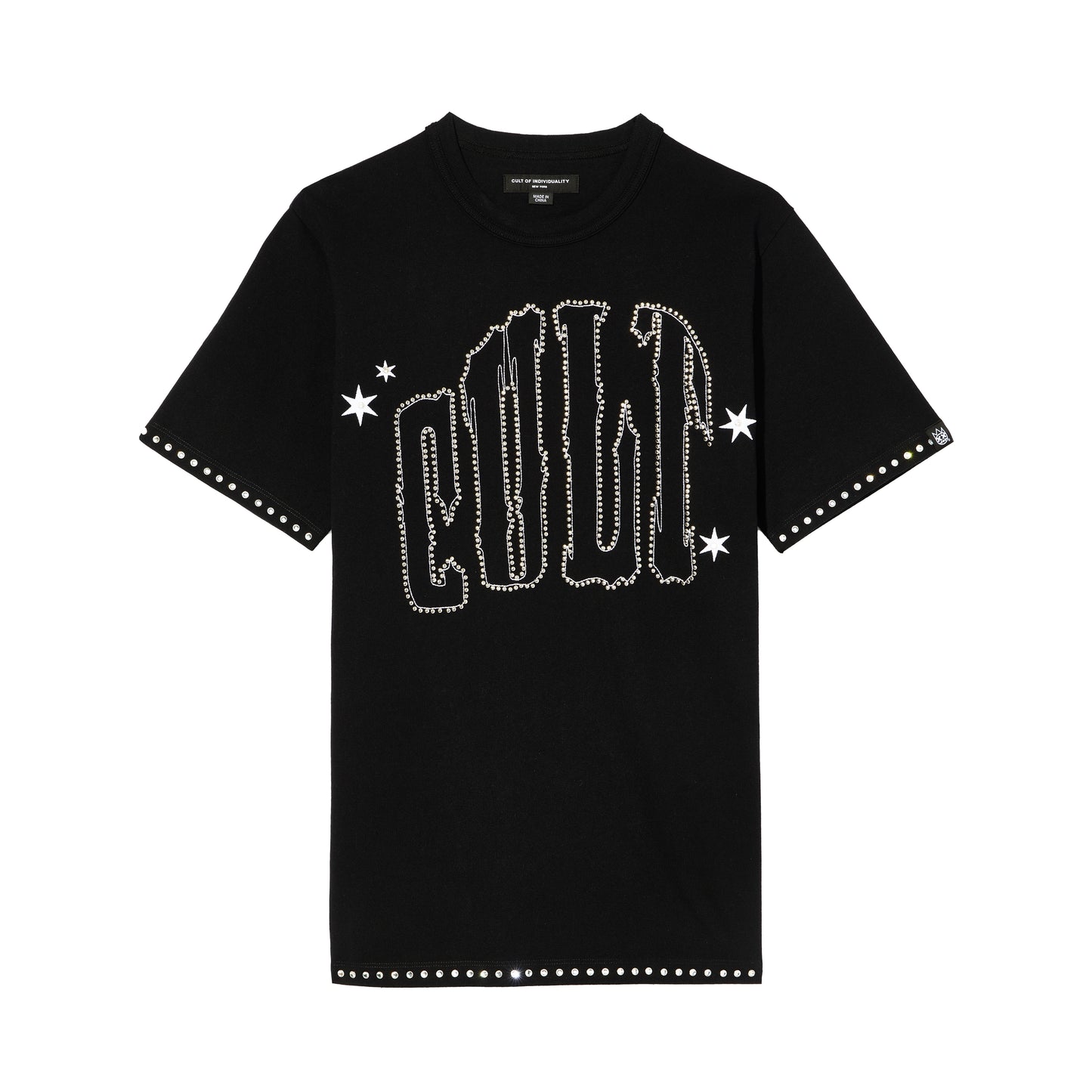 Part of our Cult x El Alfa collab, this black tee features an embroidered oversized "Cult" logo on the front accented with crystal detailing on the hem and sleeves. Meticulously crafted from premium cotton and elevated with detailed graphics, this unique collab tee is a piece that will not only feel great but will set you apart from the crowd. Show your El Alfa pride with style.