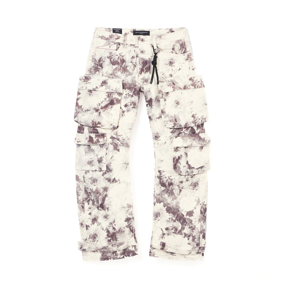 This baggy cargo style is our loosest fit yet with a 20" leg opening. The relaxed baggy fit of these cargo jeans provide both freedom of movement and a distinct edge to your wardrobe. Crafted from a premium denim, with large cargo pockets, and an all over floral digital print. The finishing touches of this jean include; our signature back pocket flasher, drawcord keychain, and Cult signature XX on back leg.