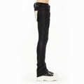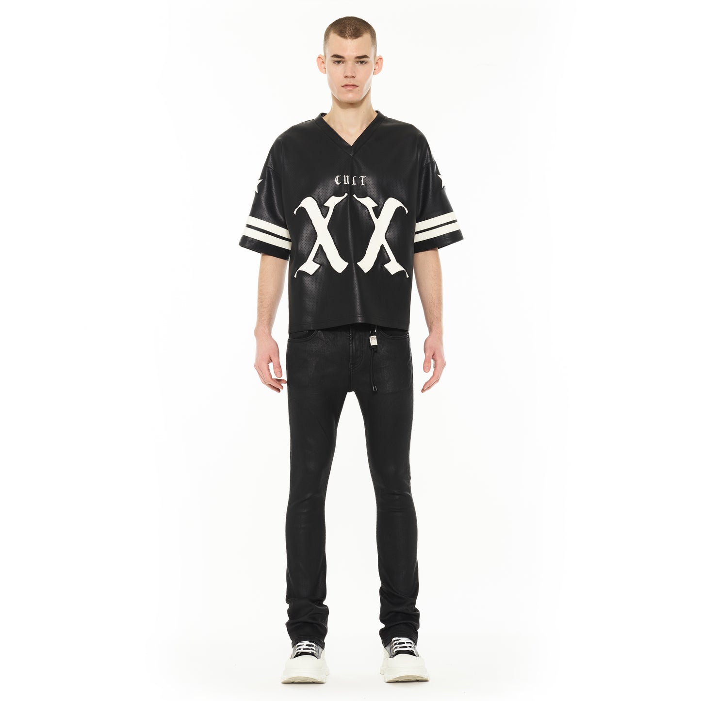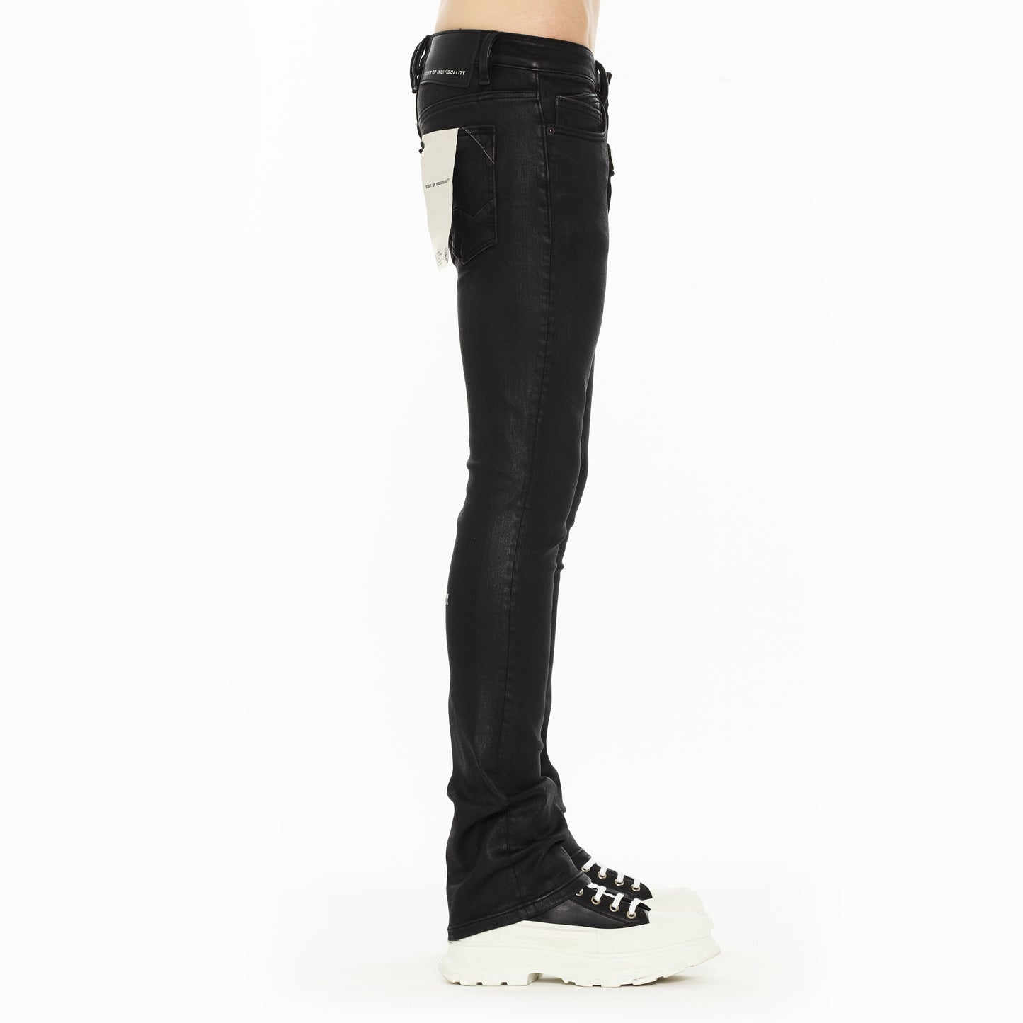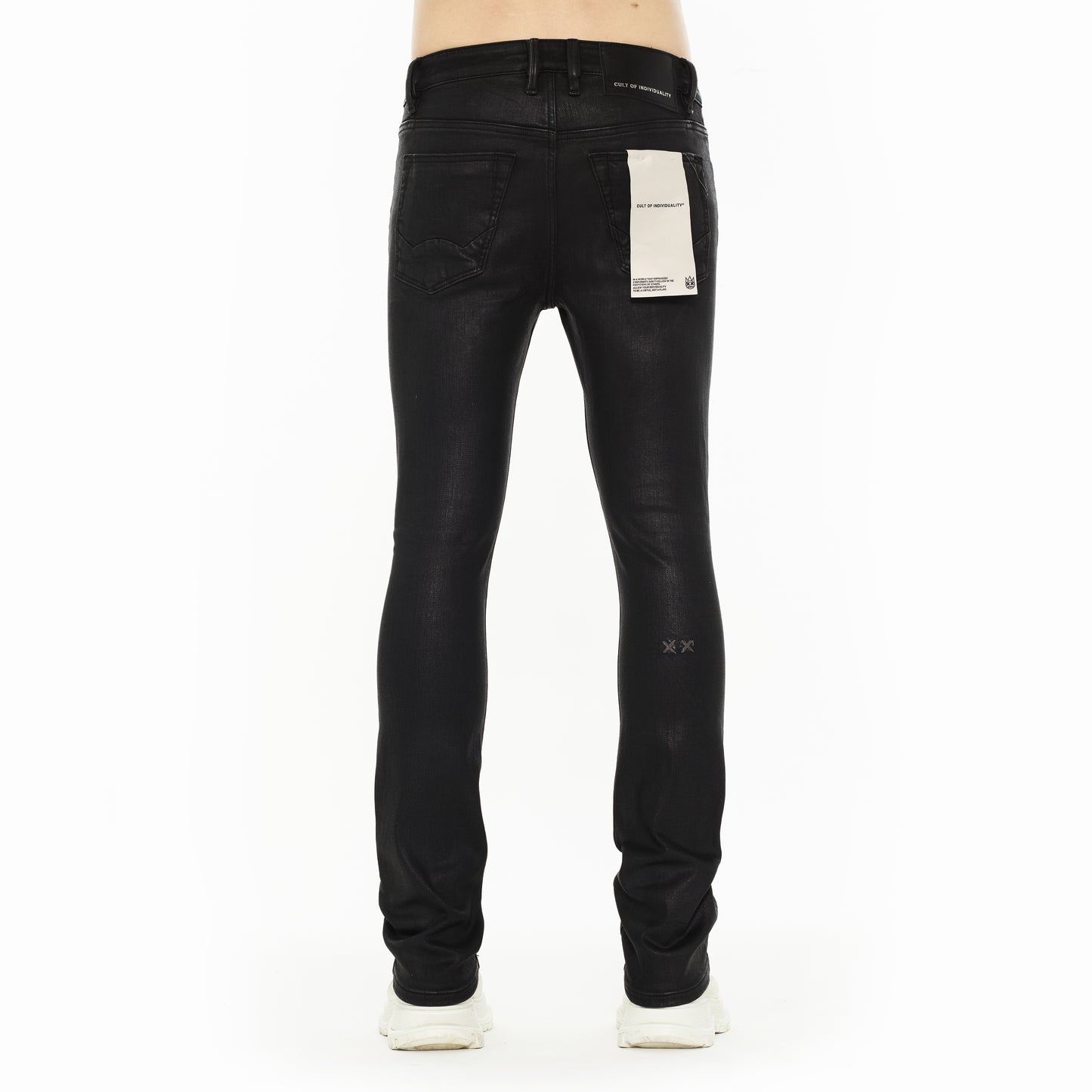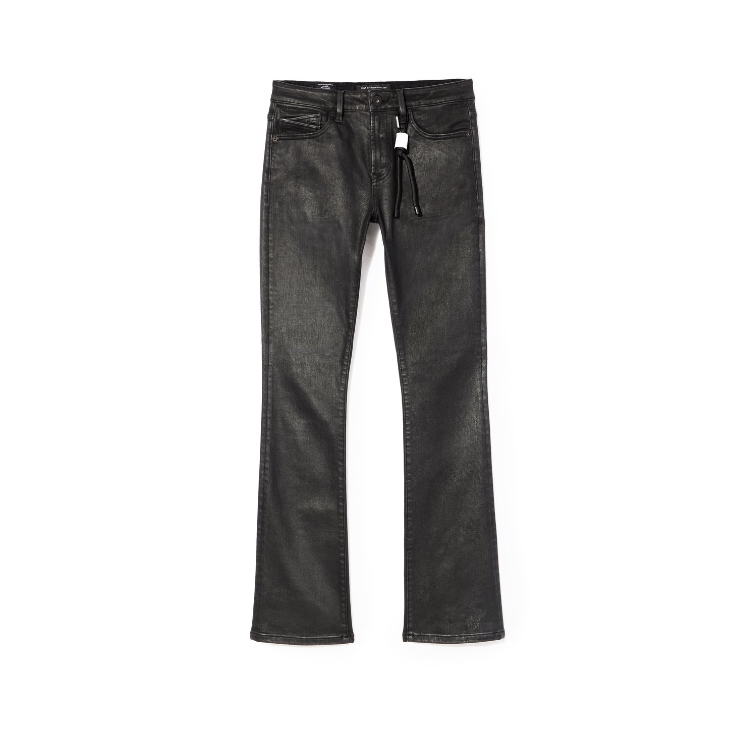 This Lenny bootcut style has a wider leg from knee to ankle. This jean is crafted from a premium black denim overlaid with a coating that adds a sleek finish. This jean is finished with our signature back pocket flasher, drawcord keychain, and Cult signature XX on back leg.