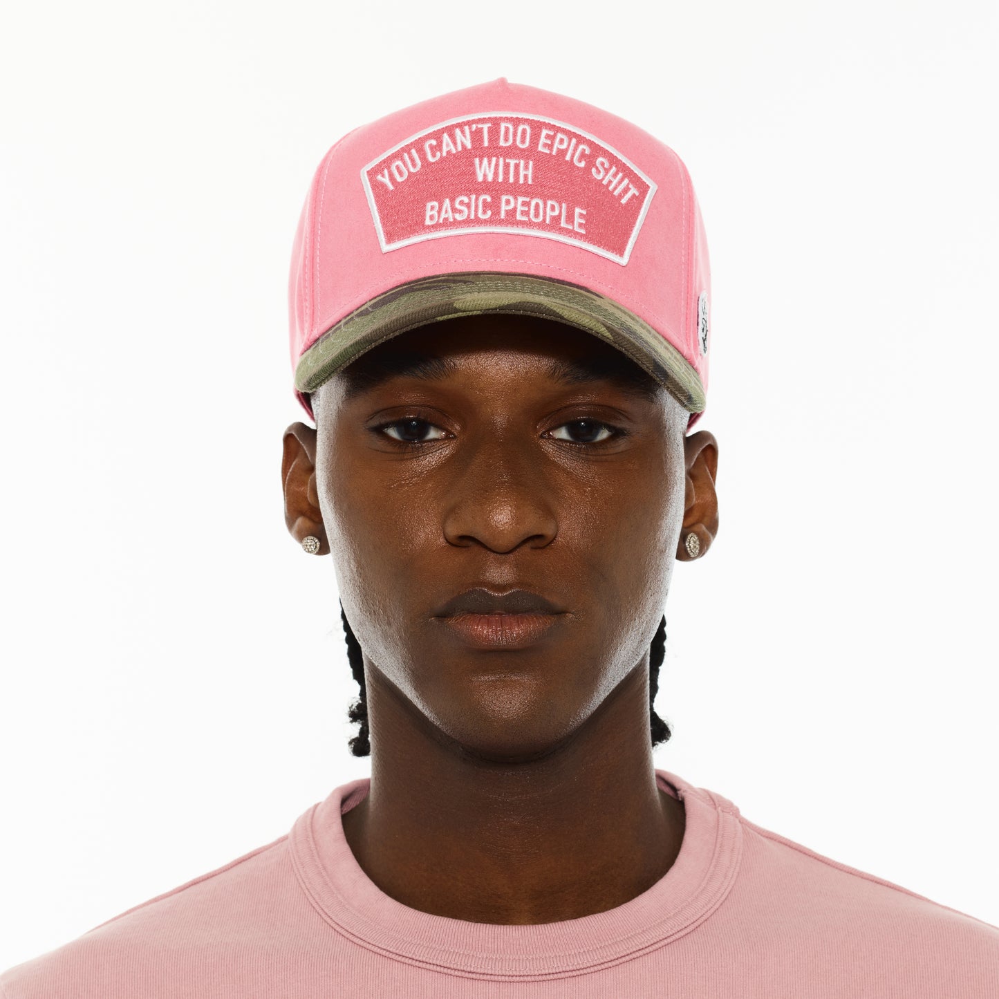 Elevate your fit with our latest mesh back trucker. This trucker features a suede crown in geranium pink and a canvas camo visor. The front of the hat is adorned with an embroidered patch. The adjustable strap ensures a perfect fit for every head size, while the breathable mesh back fabric keeps you cool even on the hottest days.