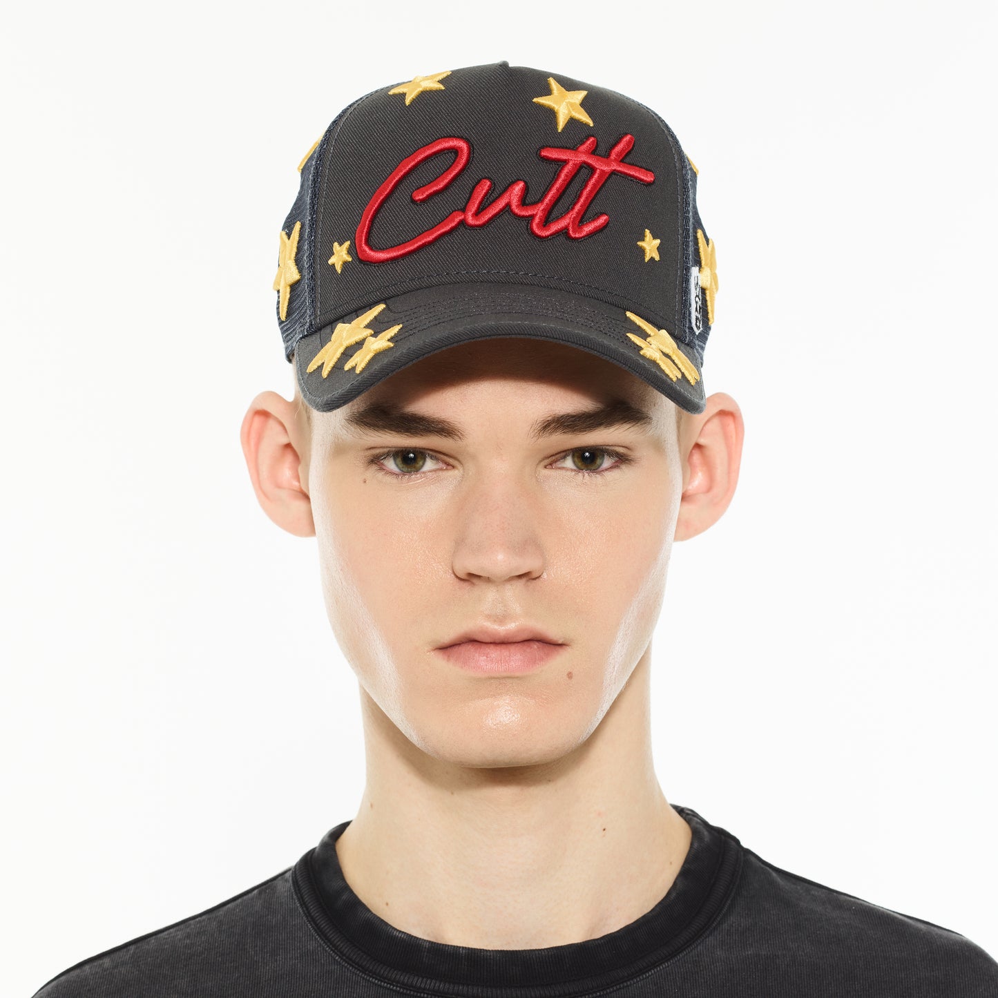 Elevate your fit with our latest mesh back trucker in steel grey. This hat is adorned with a high quality 3D embroidered logo that on the crown and 3D embroidered stars all over. The adjustable strap ensures a perfect fit for every head size, while the breathable mesh back fabric keeps you cool even on the hottest days.