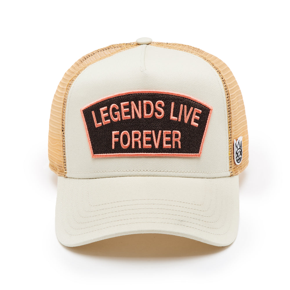 Cult's Logo Mesh Back Trucker Hat "Legends Live Forever" in White Swan