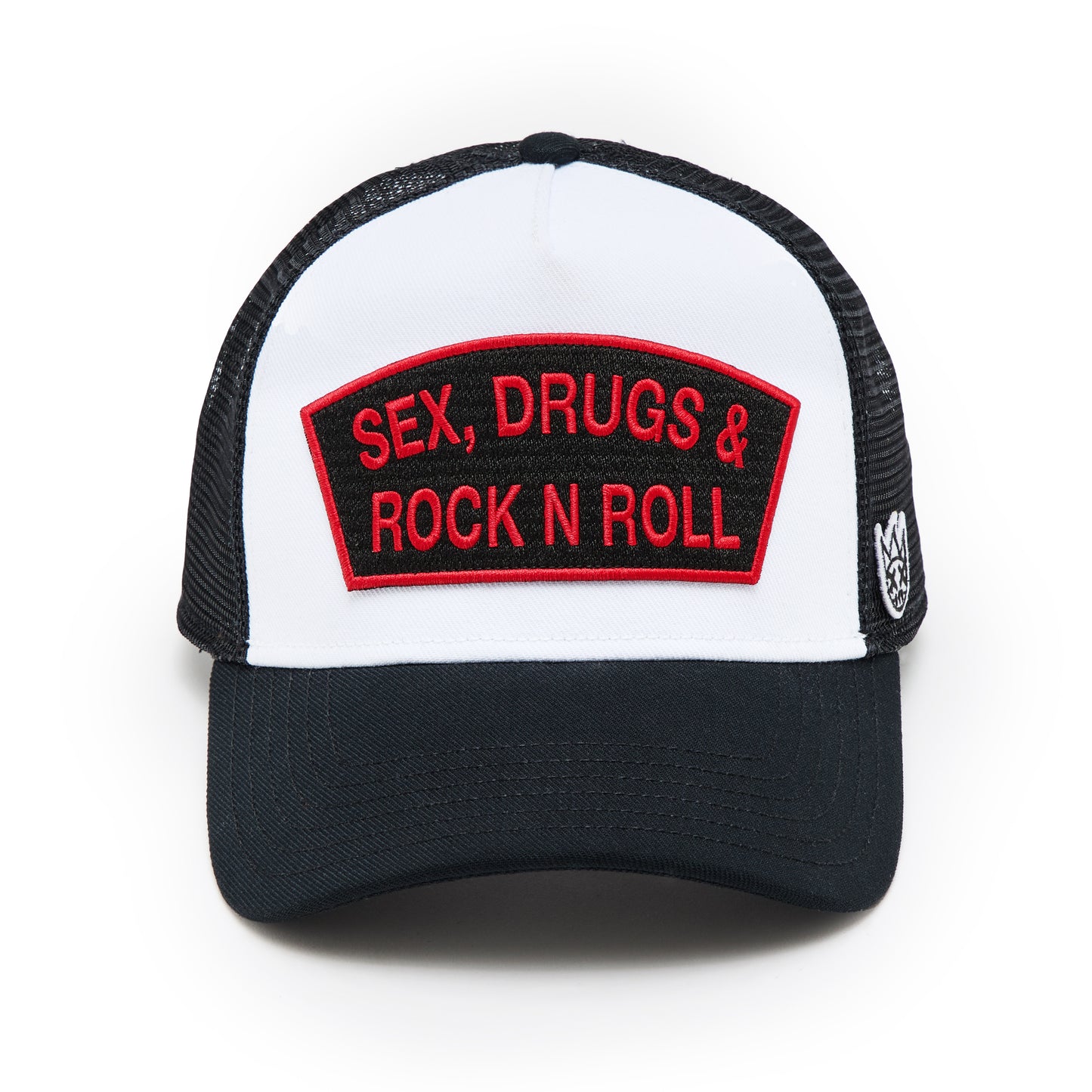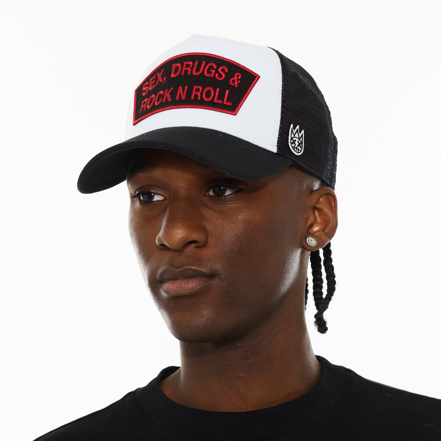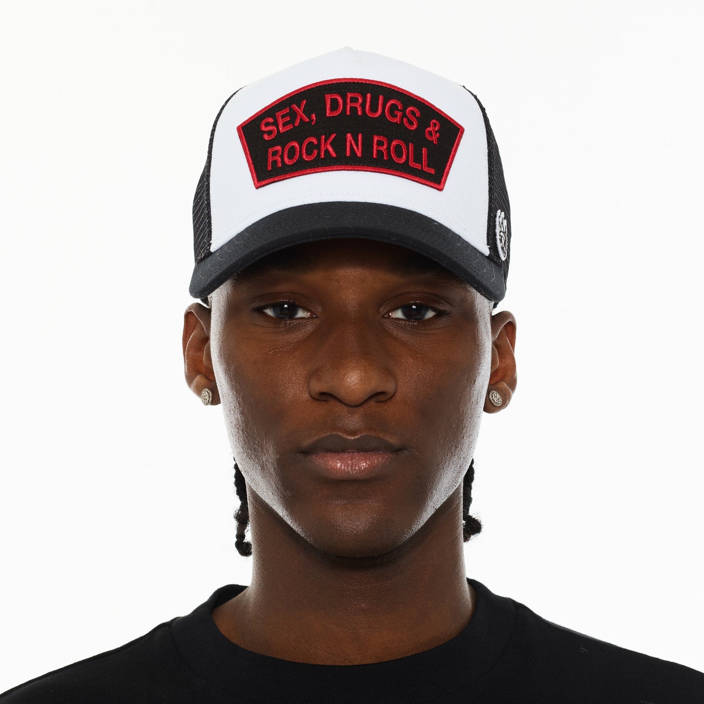 Cult's Logo Mesh Back Trucker Hat "Sex Drugs Rock N Roll" in White