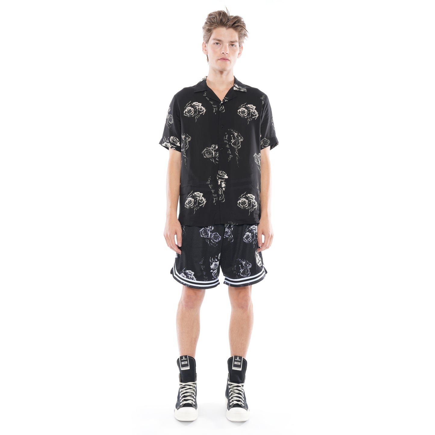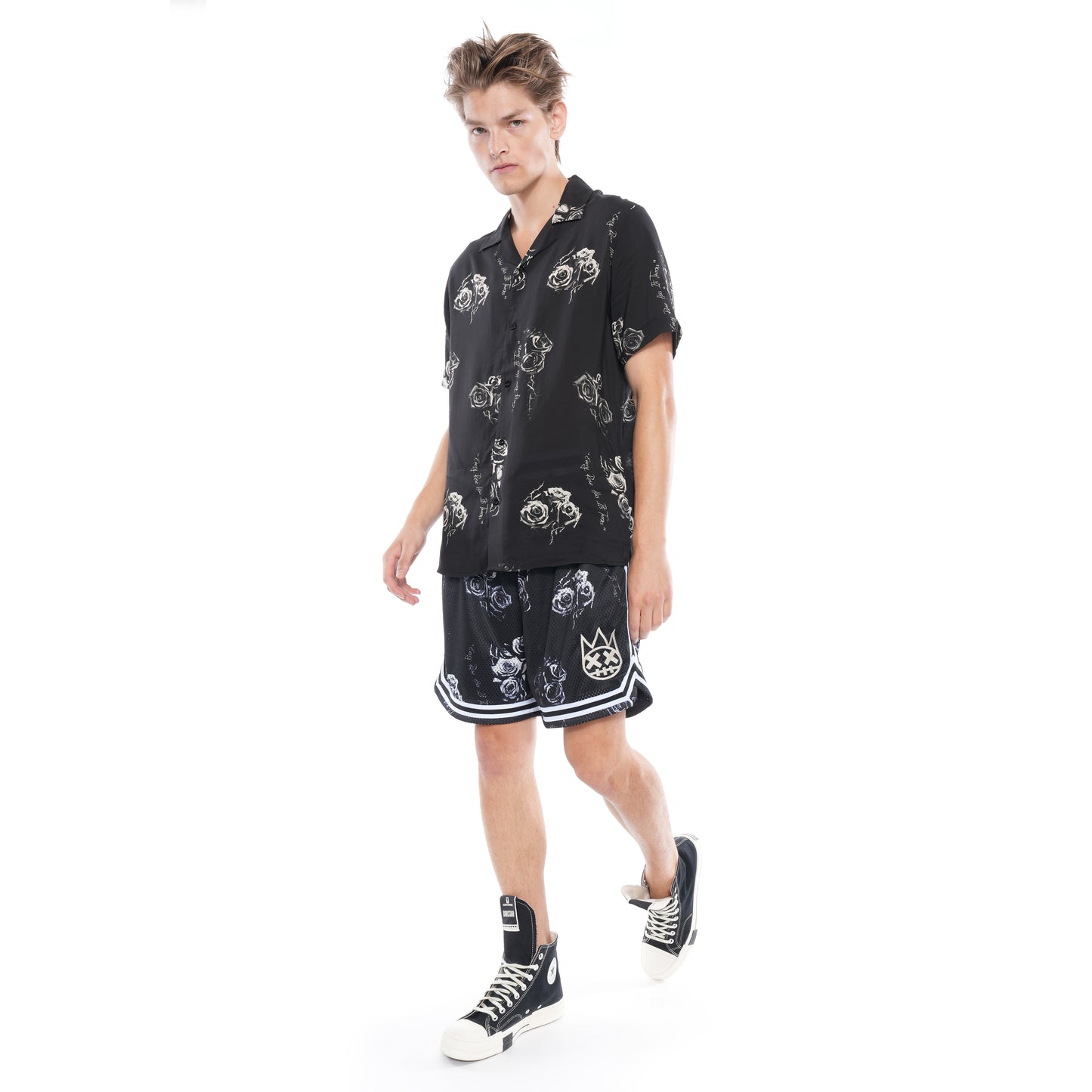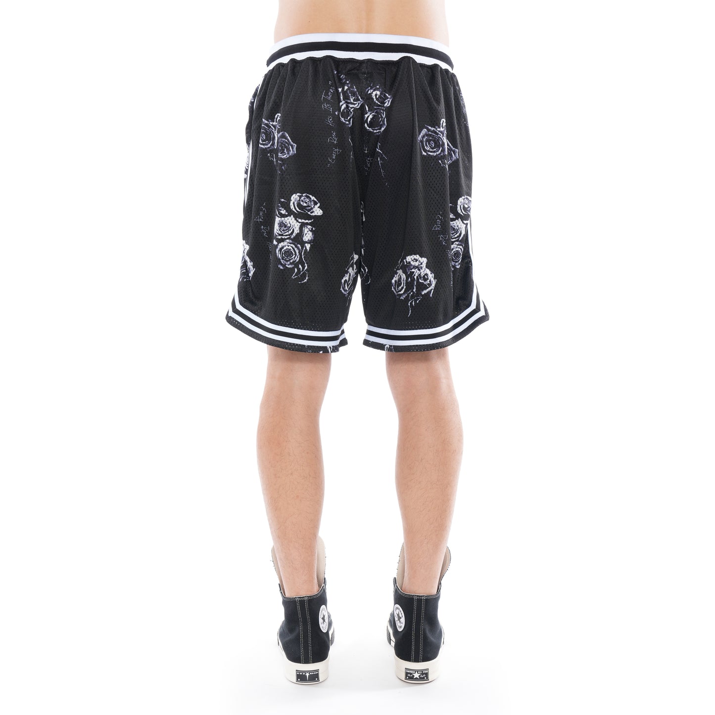 Relaxed fit mesh basketball shorts in a custom Cult print . Two pockets styling with a ribbed drawstring waist and knit striped trim with vented cuffs .