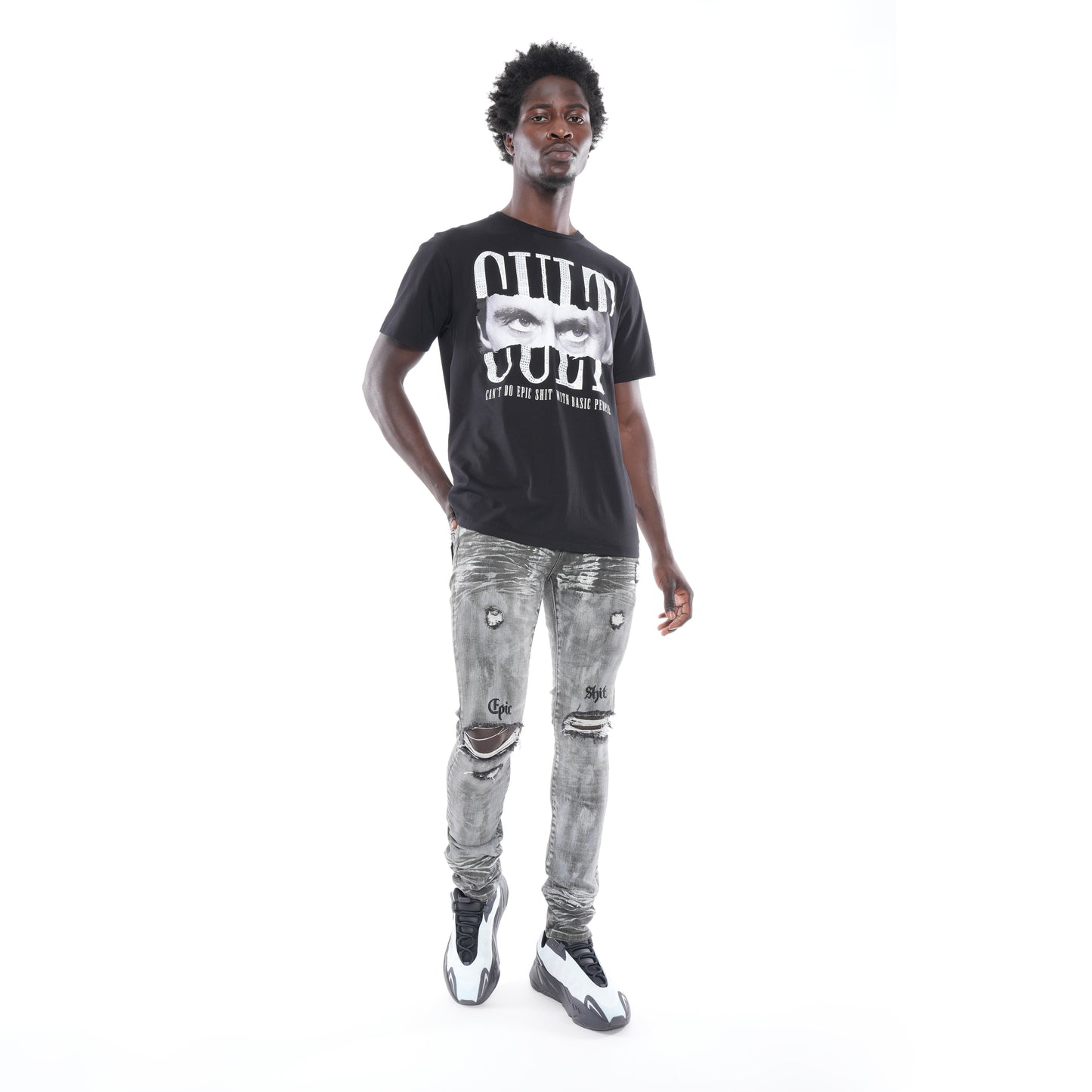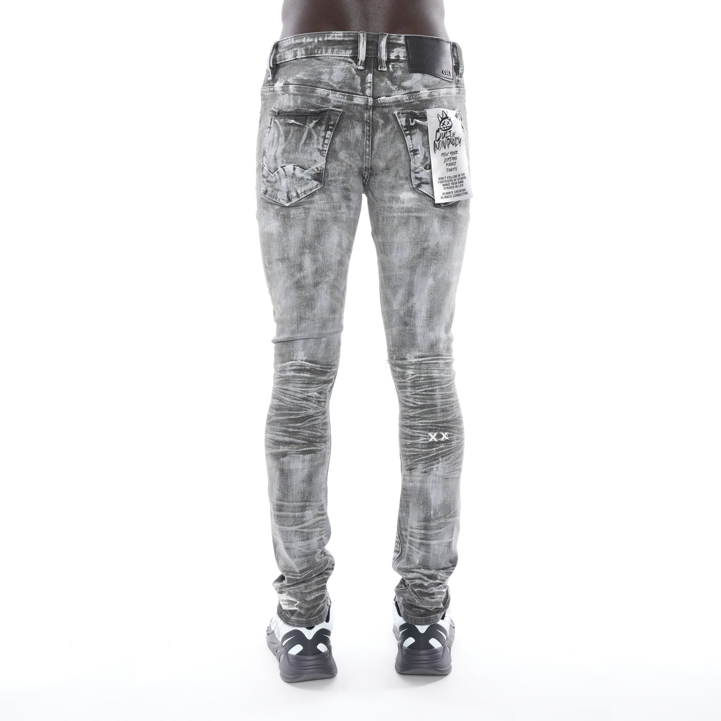 This black stretch punk super skinny style has a narrow leg from thigh to ankle. This style is crafted from a premium stretch denim, with white paint and coating, and finished with rips. This jean features Cult signature XX on back leg, and "epic shit" embroidered on knees for a unique look.
