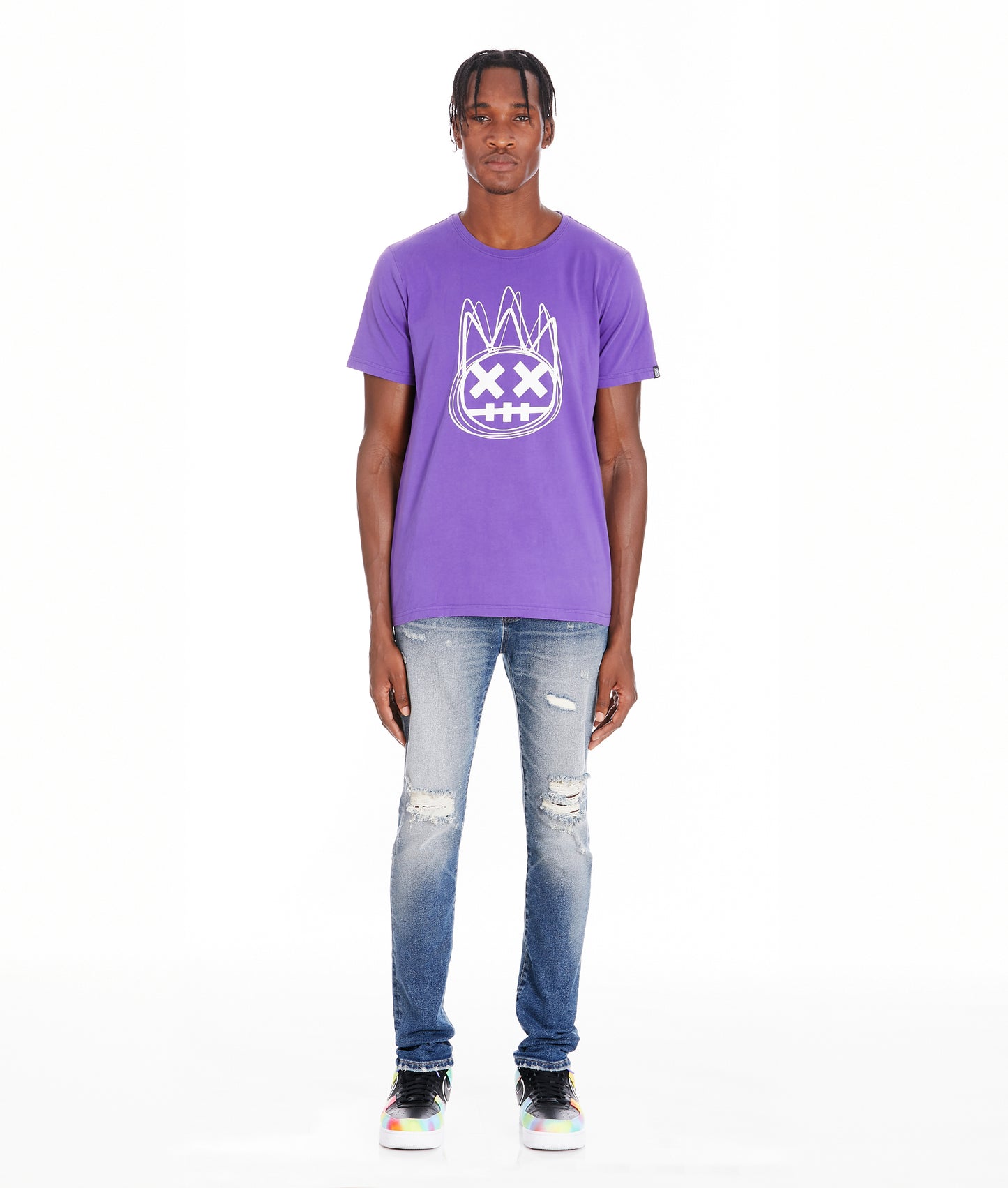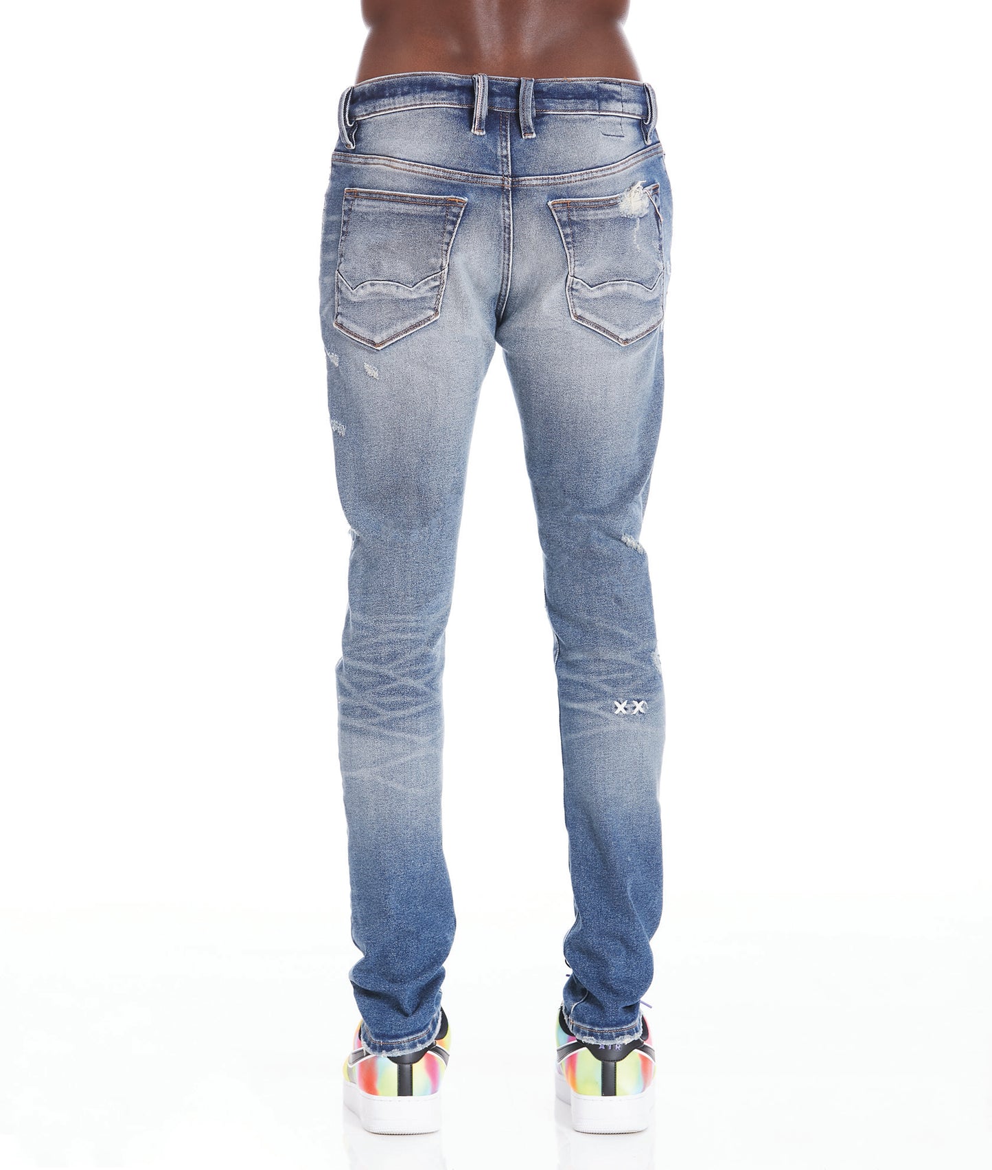 This blue stretch punk super skinny style has a narrow leg from thigh to ankle. Crafted from premium stretch denim then vintage washed with rips and repairs for a clean design. It features the cult signature selvedge trim details and XX"